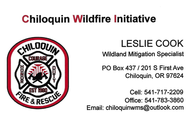 The Chiloquin Fire & Rescue's Chiloquin Wildfire Initiative offers a couple of great programs to help property owners clear defensible space around our homes. Whether you need help hauling your green waste away or need help creating your defensible space, Chiloquin Fire & Rescue can help. For more information and to schedule services call the department's Wildland Mitigation Specialist - Leslie Cook.